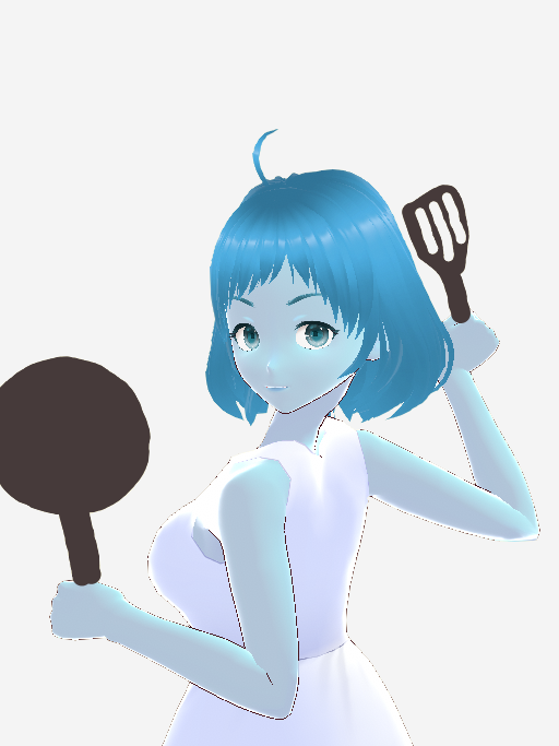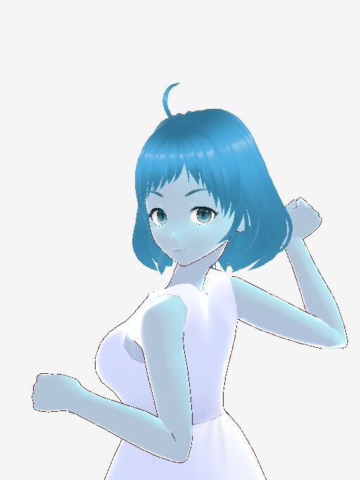 今回もキャラクターはヒロインである水の精霊ウンディーネ、プリュイです。彼女は『魔法都市カディンギルの思い出』に出てくるシナルに似ているって設定なので、シナルを真っ青して流用してます。ポーズだけでなく、小物も持っていてほしいのでVRoidに加筆しました。