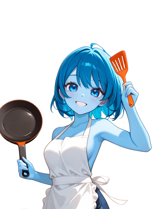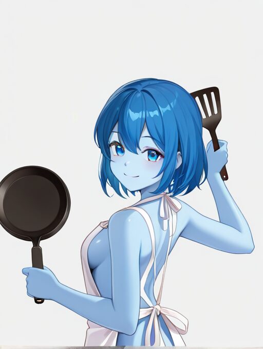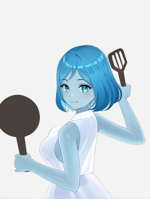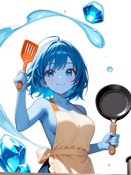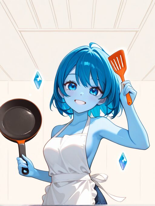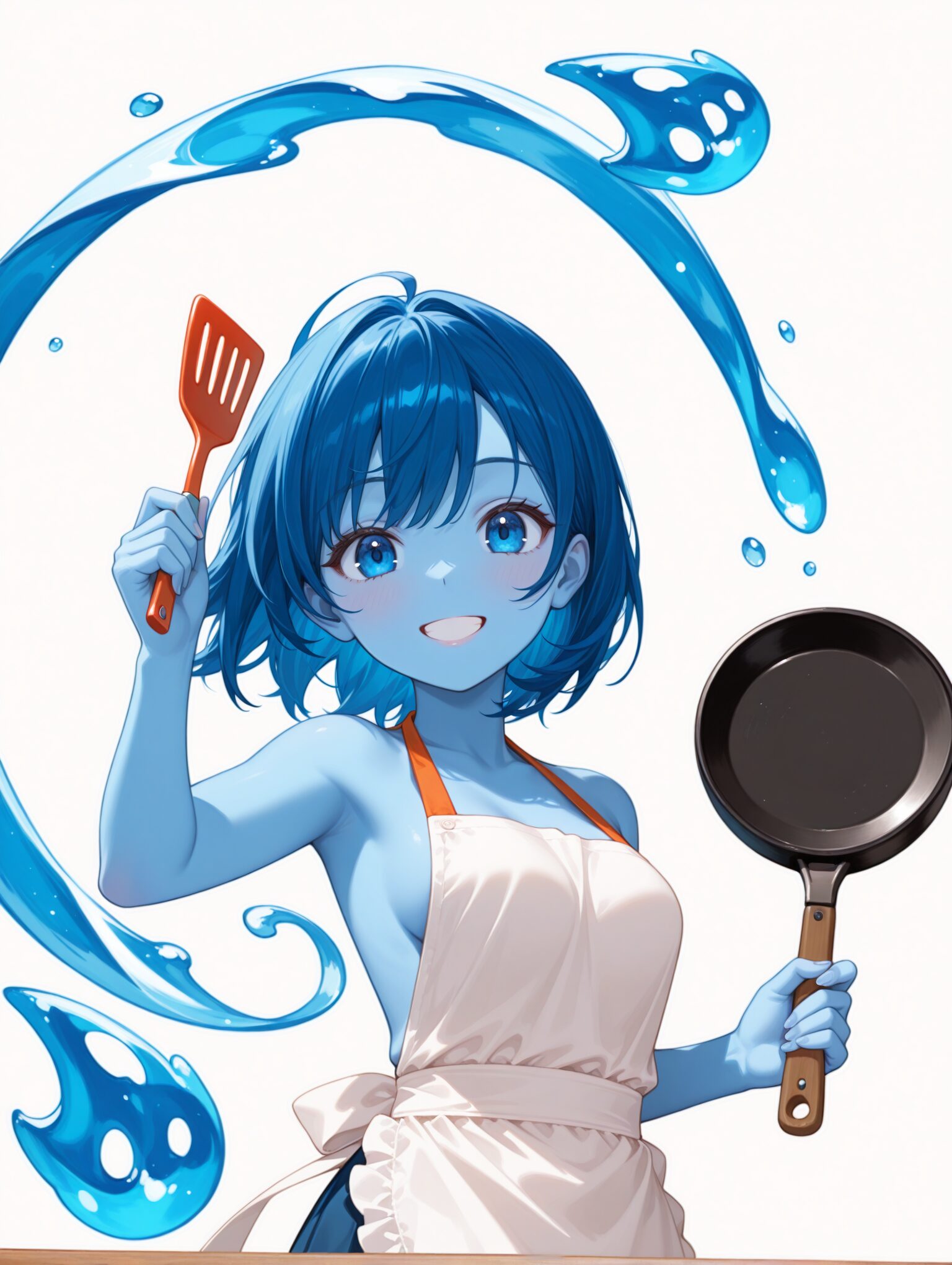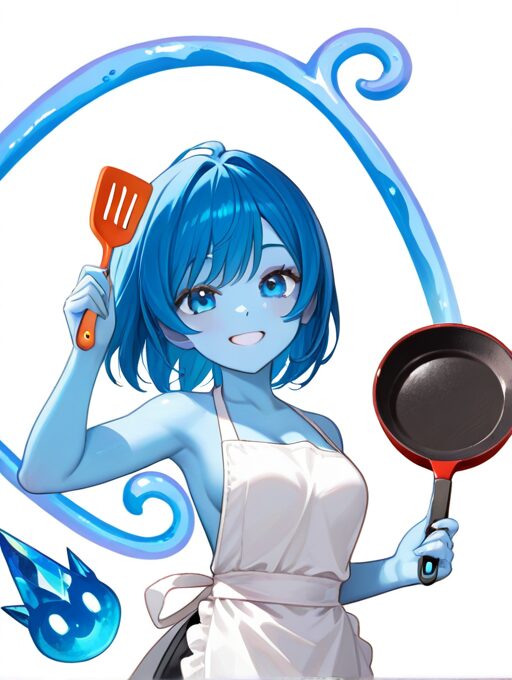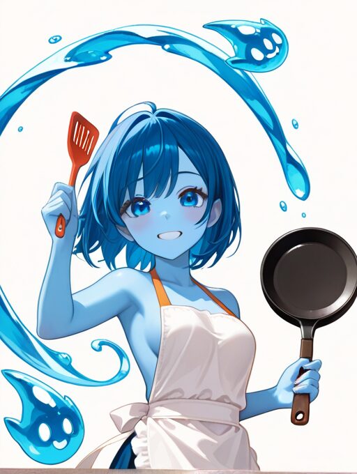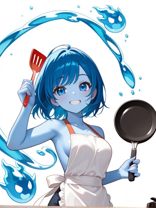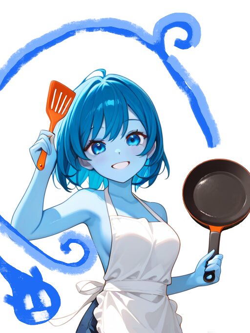 加筆VRoid画像を参考画像に設定し、モデルはもちろん「Haruka v2」パイセン、プロンプトは「smile, crystal clear water spirit, short hair, smile, blue skin, blue hair, wearing an apron cooking, frying pan in left hand, spatula in right hand」です。