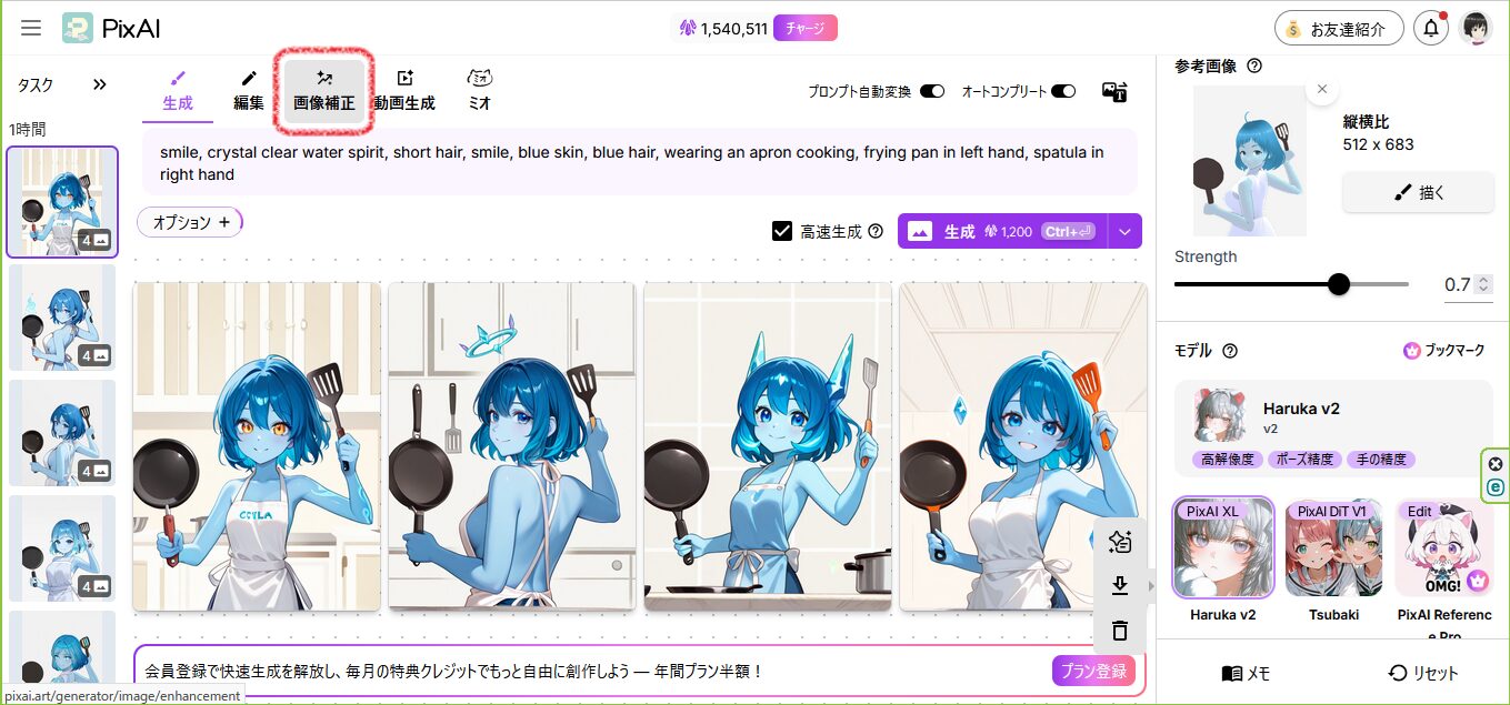 まずは生成画面上部の「画像補正」クリック。そうすると「画像補正」画面に移りますので、ここで補正したい画像を選びます。私の場合「x4生成」しているので画像選択①⇒②と2ステップ必要です。もちろんアップロードしてもOK。