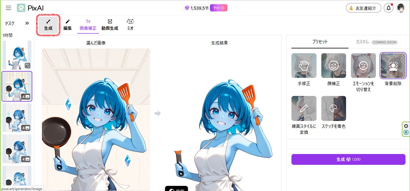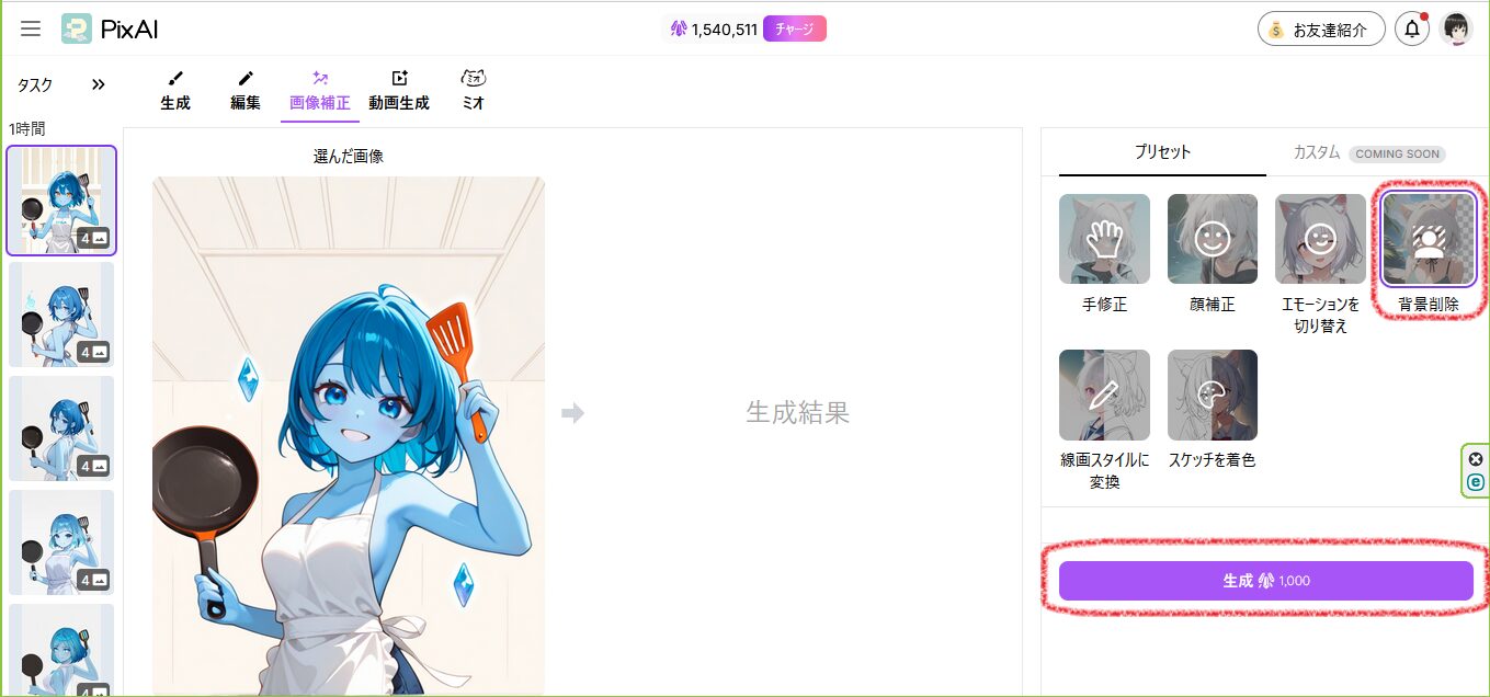 補正したい画像が選択されたら「背景削除」を選択して「生成」です。たったの1,000クレジットなので最近はガンガン使ってます。選択ツール+消しゴムに比べたらかなりの時間節約になっています。……フライパンが消えたりしますけど。