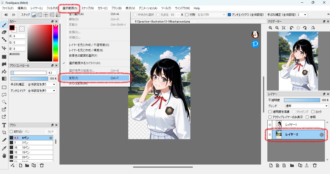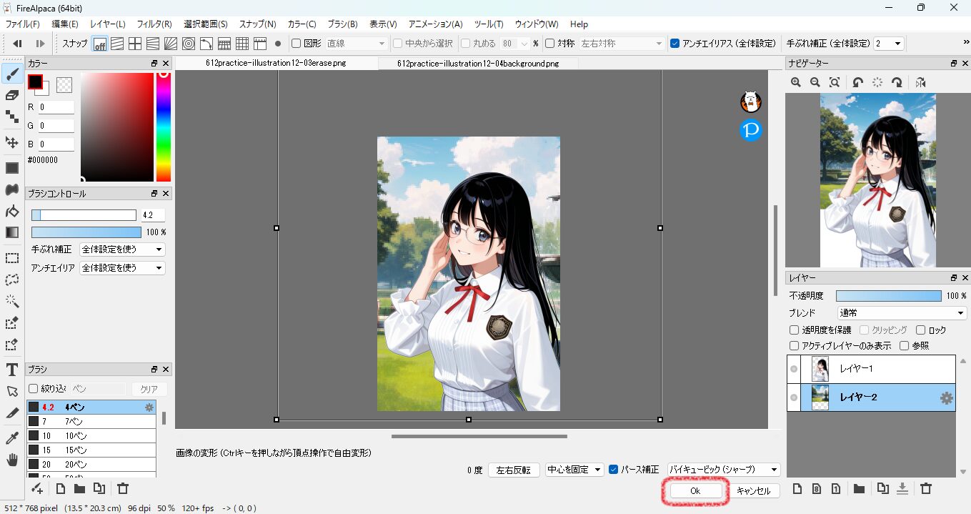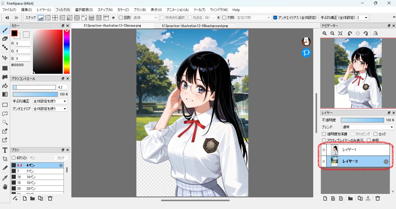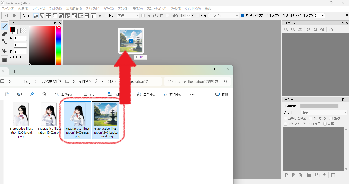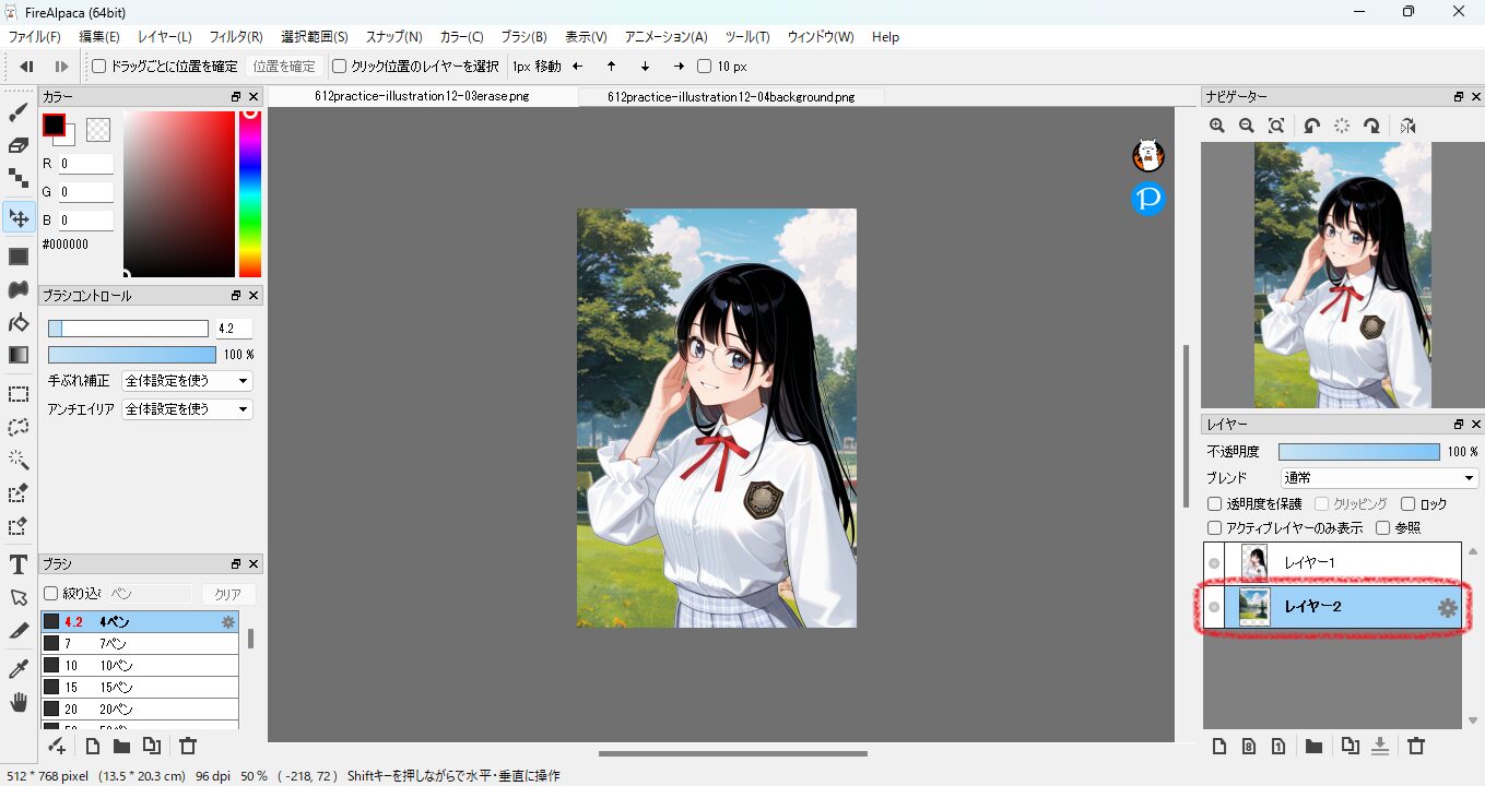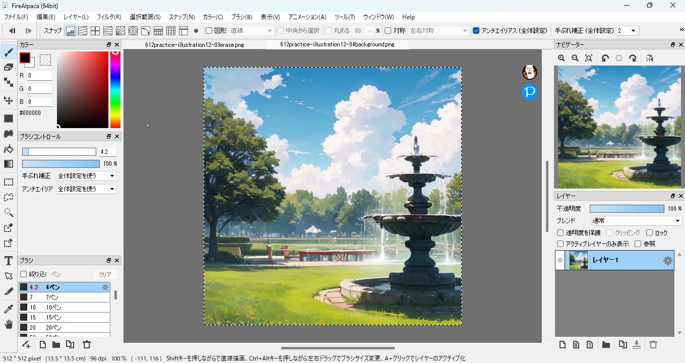 ここからは「FireAlpaca」を使います。お絵描きソフトの使い方はだいたい同じだと思いますけど、レイヤーを使ったことがないと最初はイマイチ取っつきづらい印象です。以下リンクでは背景削除に苦労していますけど、PixAI.artでも簡単にできるからありがたい(前述リンク参照)。