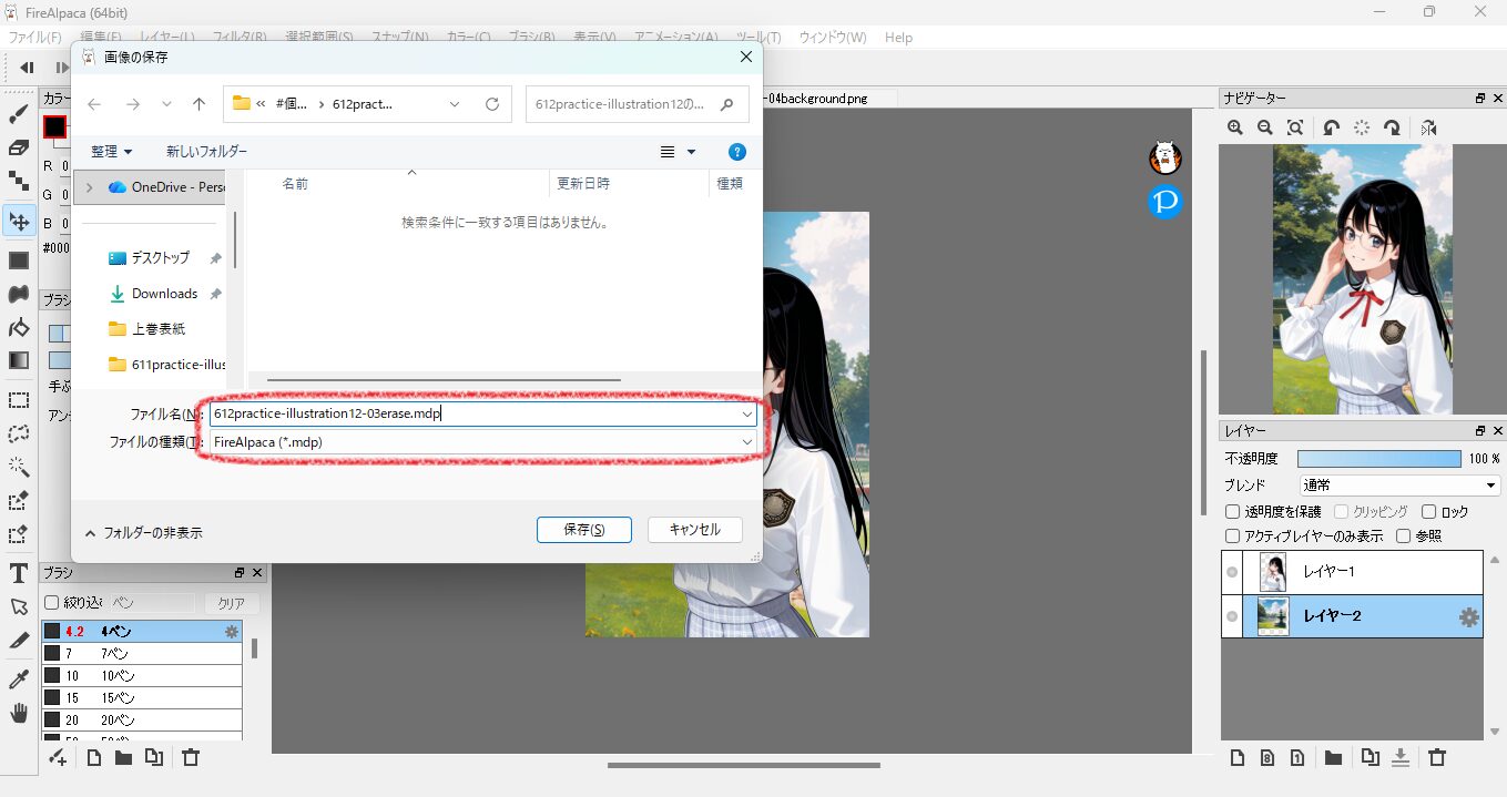 おなじみ「ファイル」⇒「名前を付けて保存」と進みます。拡張子「.mdp」はレイヤー情報含めて「FireAlpaca」で編集可能な形式。普通の画像ならPixAI.artで参考画像に設定可能&可逆圧縮な「.png」がおススメです。
