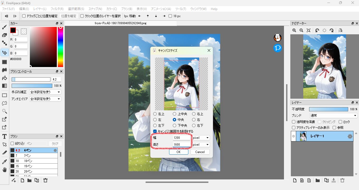 例えば私の場合、挿絵は1200×1600にしています。でも「Hires」処理は余裕をもってもっと大きくしていますし、そもそも縦横比が異なる。これを目的の挿絵サイズにするためには、画像解像度とキャンバスサイズの調整が必要です。