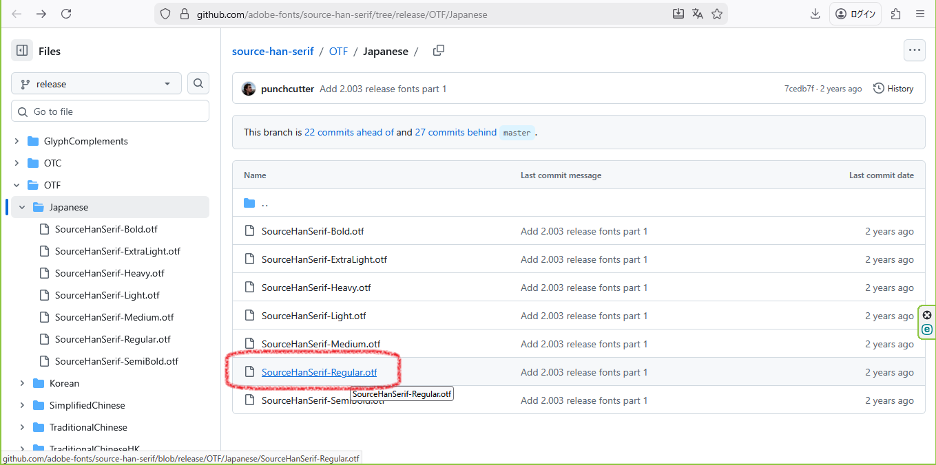ZIPでも何でもダウンロードしてインストールすればOK。……なんですけど私自身ちょっと手間取ったので、備忘録的に実例紹介します。上記サイトから下の方「GitHubで(英語のみ)」へと進み「OTC」を選択(「源の明朝」フォントのフォルダが表示されます)。
