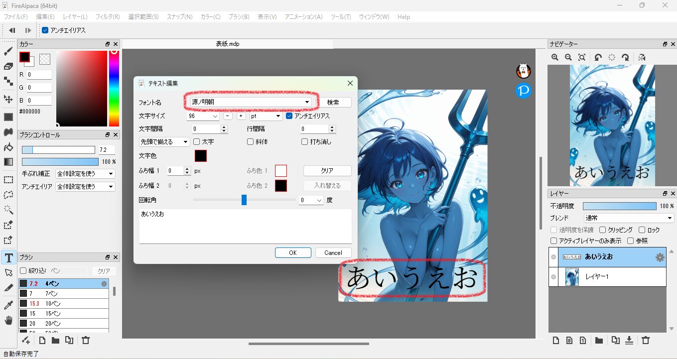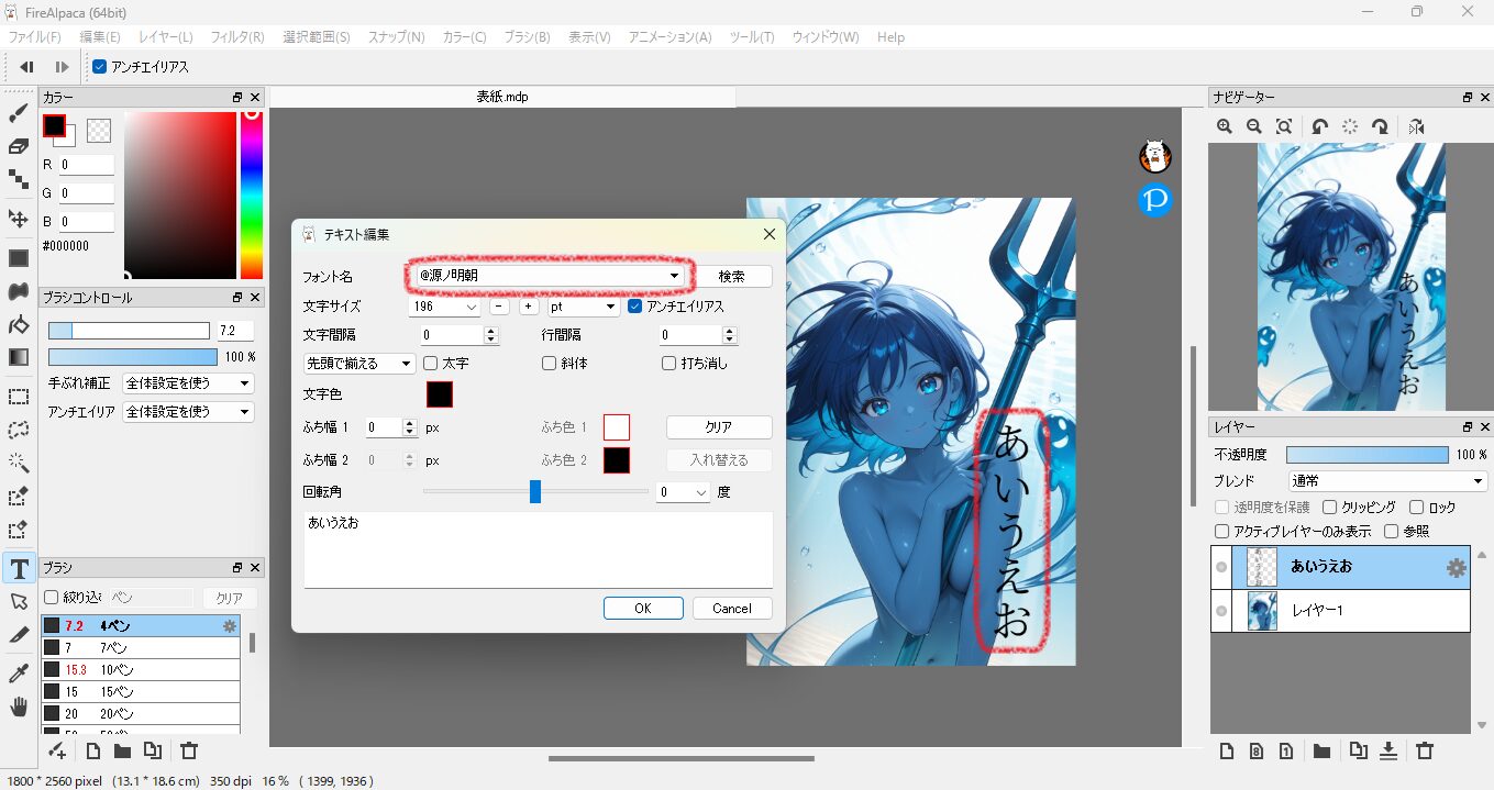 まずはFireAlpacaで表紙絵を開き、「テキストツール」を選択。文字を配置したいあたりでクリックすると「テキスト編集」ウィンドウが出てきます。「フォント名」で「@源の明朝」を選べば縦書きになりますし、「源の明朝」だと横書きです。