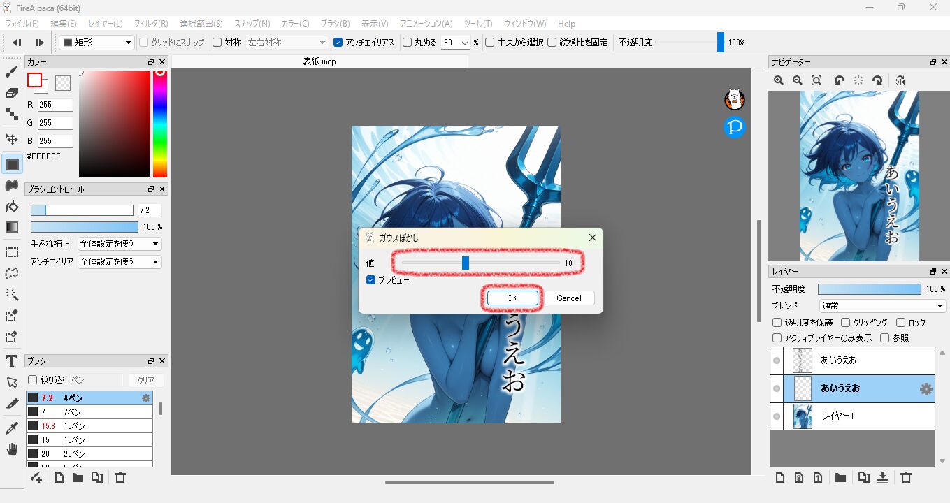 まずはぼかしたいレイヤー(先ほどの縁取りレイヤー)を選択して、メニュー「フィルタ」⇒「ガウスぼかし」です。「ガウスぼかし」ウィンドウで「値」を調整して「OK」。これだけで縁取りのぼかしは完了です。