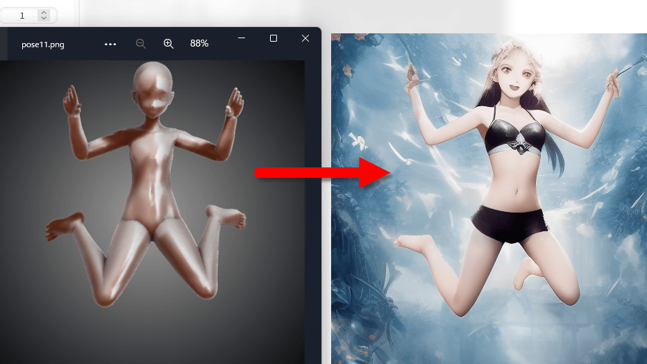 ちなみに最近知ったんだけど「Stable Diffusion」で「ControlNet」を使うと、キャラクターに好きなポーズをとってもらえるらしい。